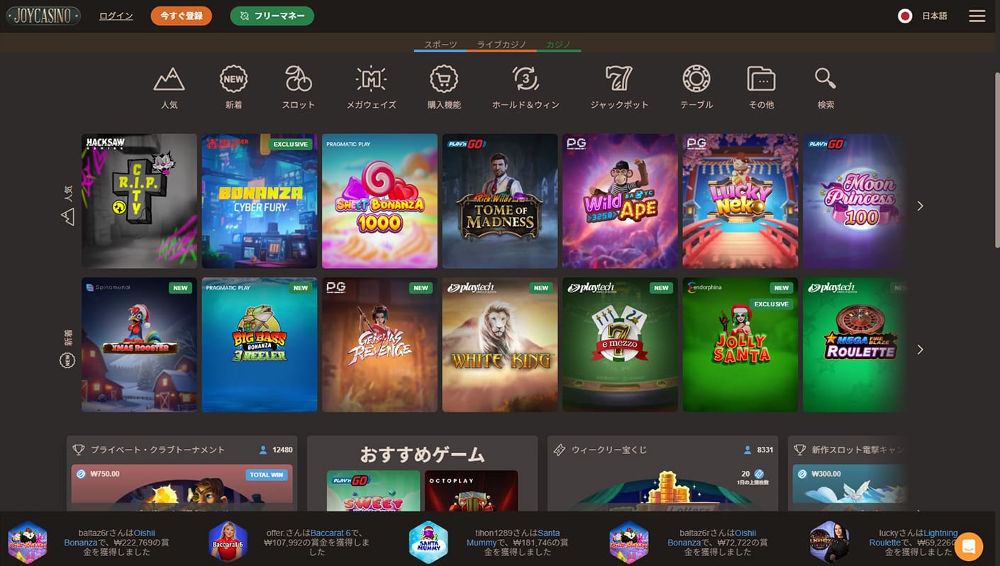 Joy Casinoは、スロット、テーブルゲーム、ライブディーラーオプションなど、幅広いカジノゲームを提供するオンラインゲームプラットフォームです。ユーザーフレンドリーなインターフェイス、トップソフトウェアプロバイダーの膨大なゲームの選択、およびプレーヤーのための安全な環境で知られています。Joy Casinoは、新規プレイヤーと既存プレイヤーの両方にさまざまなゲームオプション、魅力的なボーナス、プロモーションを提供することで、楽しく没頭できる体験を作り出すことを目指しています。