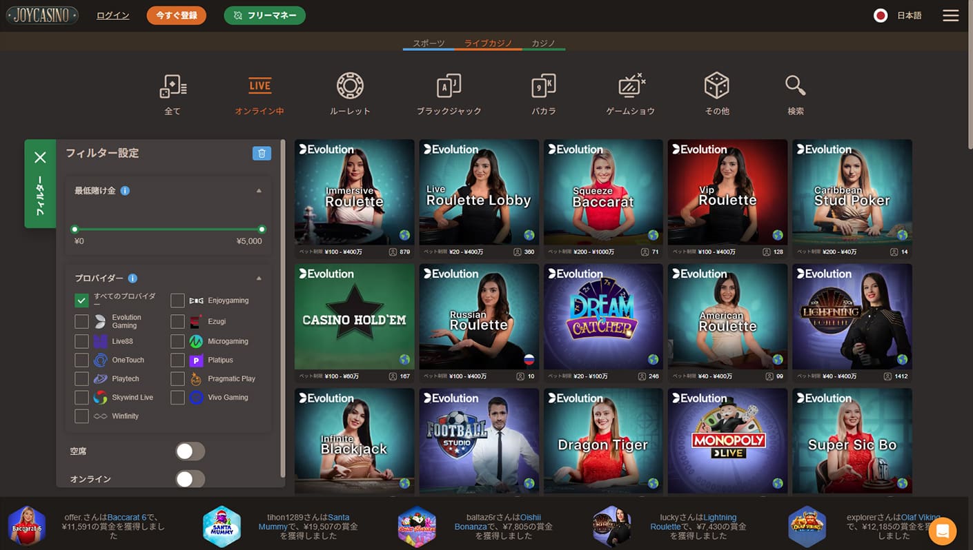 Joy Casinoでは、Evolution Gamingのライブカジノをお楽しみいただけます。プレイヤーは、ブラックジャック、ルーレット、バカラなどの人気ゲームをプレイしながら、プロのディーラーとリアルタイムで交流することができます。