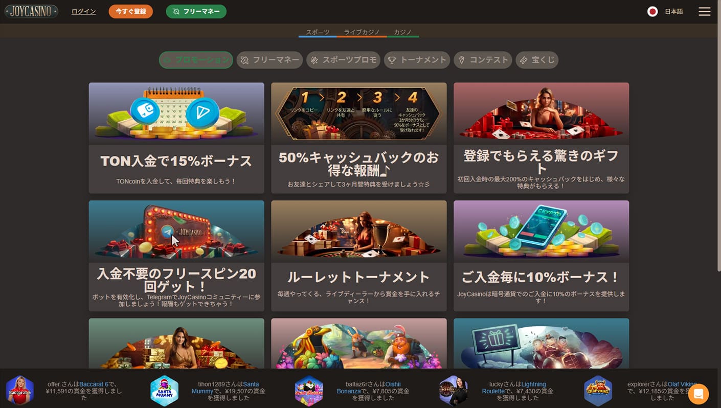このプラットフォームは、魅力的なボーナスとプロモーション、ユーザーフレンドリーなインターフェース、そして安全な取引環境で際立っています。さらに、Joy Casinoは、電子財布や暗号通貨を含む複数の支払い方法に対応しており、入金および出金の柔軟性を提供しています。24時間対応のカスタマーサポートとロイヤルティプログラムも、全体的な体験をさらに向上させています。