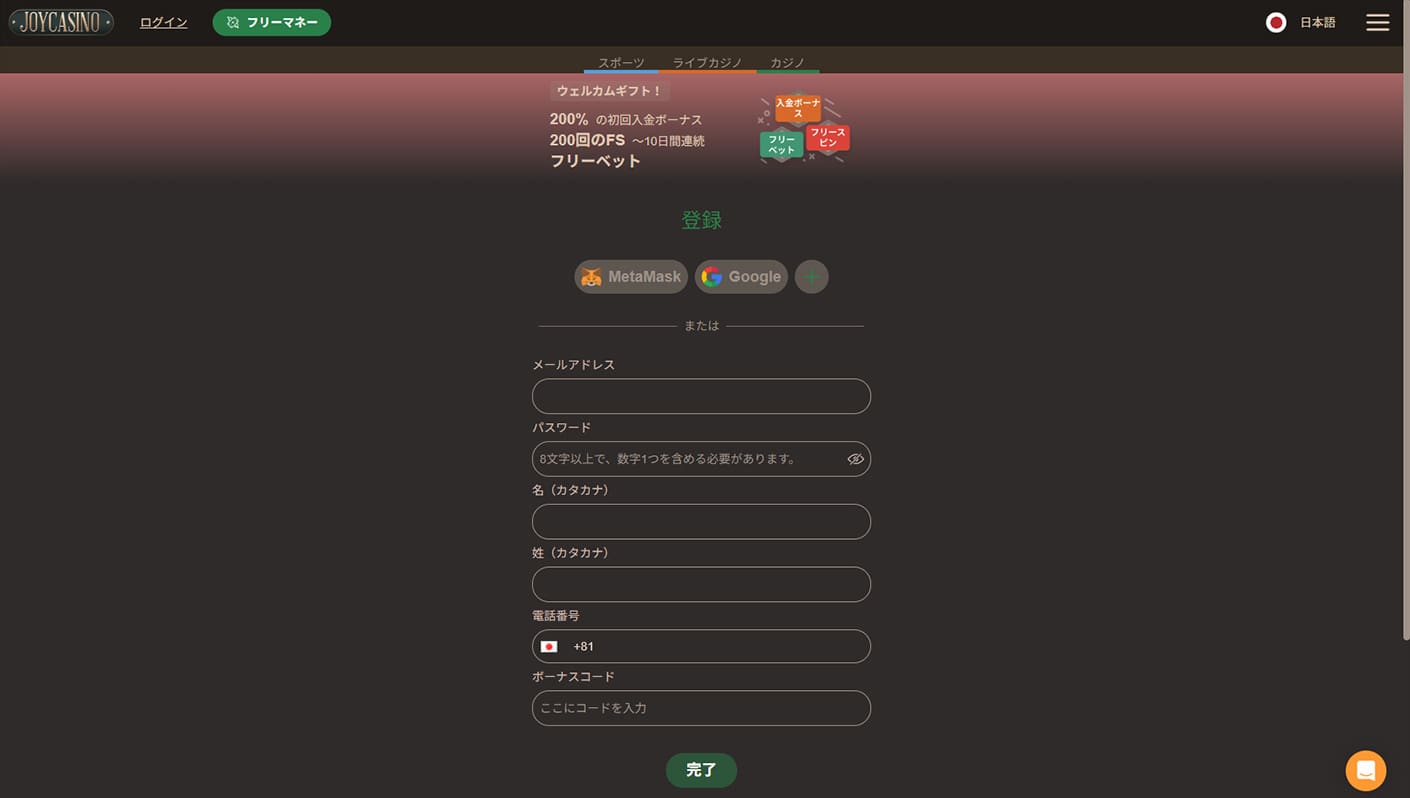 Joy Casinoのウェブサイトで「サインアップ」ボタンをクリックします。名前、メールアドレス、生年月日などの個人情報を入力し、登録が完了したら、資金を入金してゲームをプレイできます。